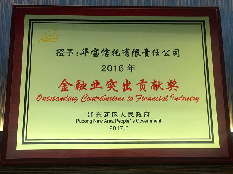 2017年3月29日,“2016年度浦东新区经济突出贡献企业表彰大会”在上海举行,华宝信托被授予“2016年浦东新区金融业突出贡献奖”。政协上海市浦东新区委员会主席严旭、政协上海市浦东新区委员会秘书长奚德强等领导出席表彰会并为获得荣誉的企业颁奖。